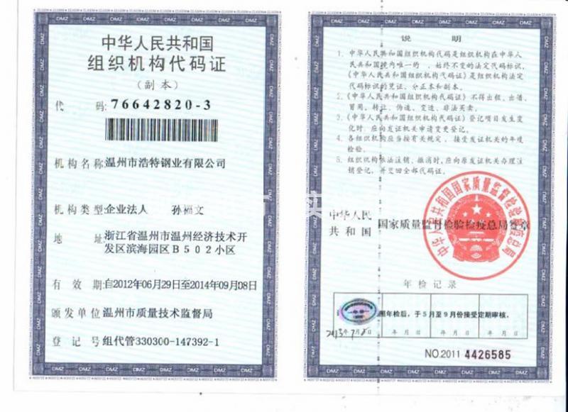 | 企業(yè)名稱 | 溫州市浩特鋼業(yè)有限公司 | 統(tǒng)一社會信用代碼 | 330305000010338 |