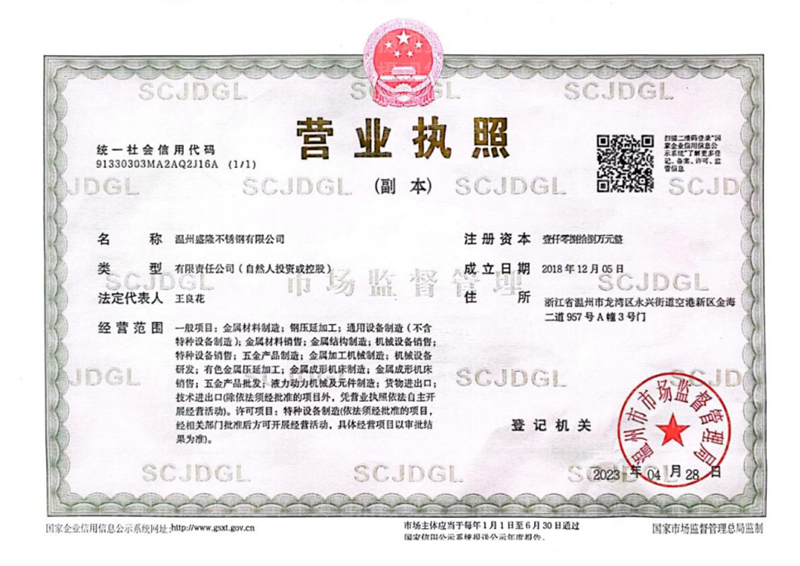| 企業名稱 | 溫州盛隆不銹鋼有限公司 | 統一社會信用代碼 | 91330303MA2AQ2J16A |