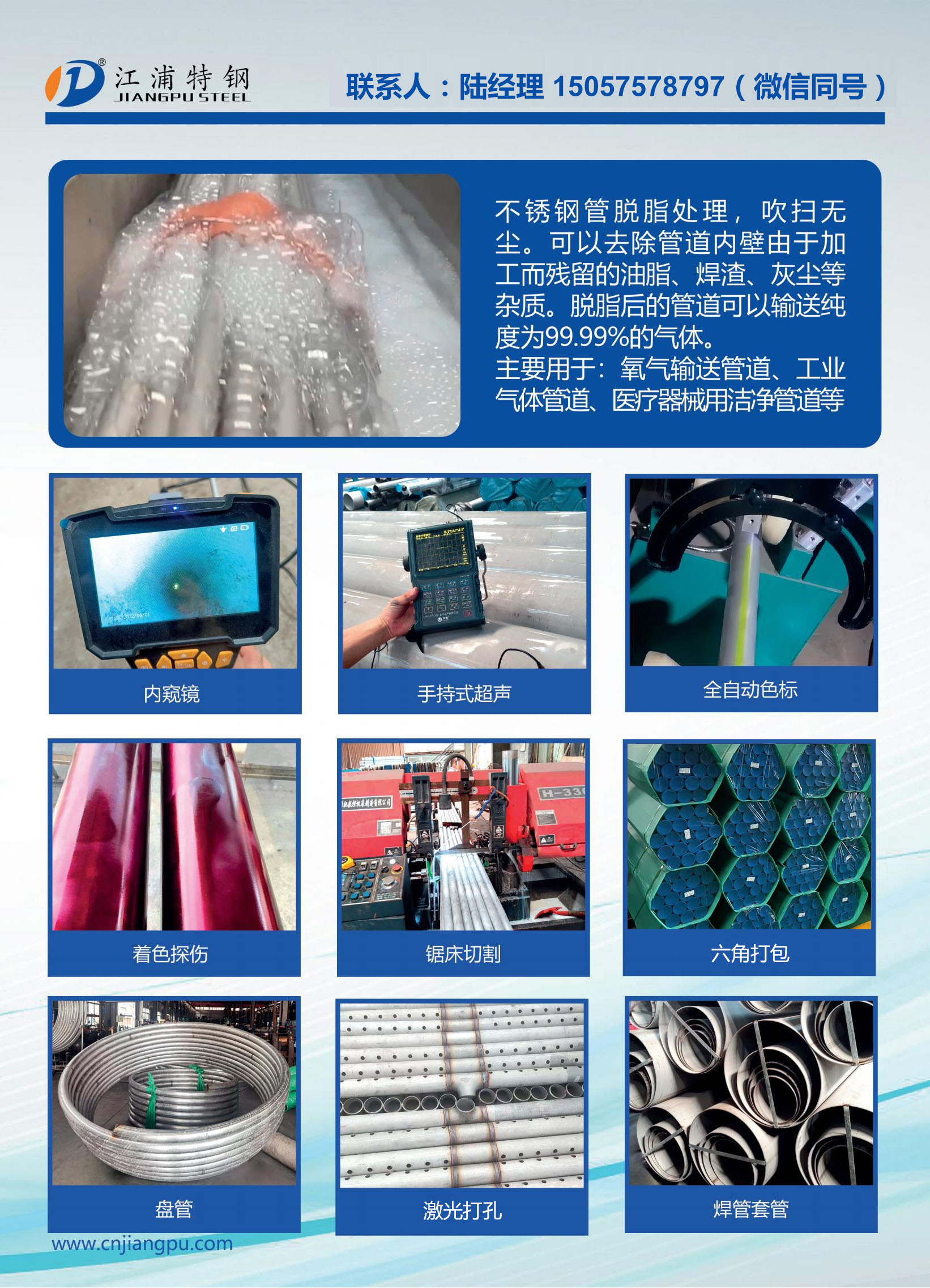 外加工:精檢包裝,切定尺,坡口倒角,酸洗,脫脂,鈍化,沖洗,水壓測(cè)試,渦流探傷,超聲波探傷,光譜檢測(cè),自動(dòng)噴色標(biāo)等管道加工服務(wù)。 力學(xué)性能試驗(yàn):化學(xué)成分分析,屈服強(qiáng)度,抗拉強(qiáng)度,硬度,壓扁試驗(yàn),晶間腐蝕等加工服務(wù)。