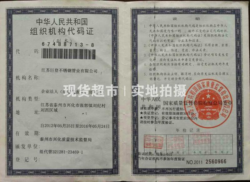 • 江蘇巨登不銹鋼管業有限公司,組織機構代碼