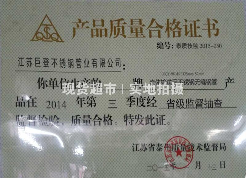 • 江蘇巨登不銹鋼管業有限公司,產品質量合格證書