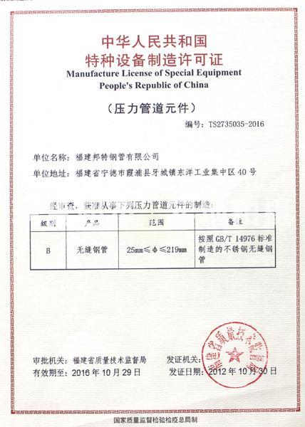 • 福建邦特鋼管有限公司,特種設備許可證
