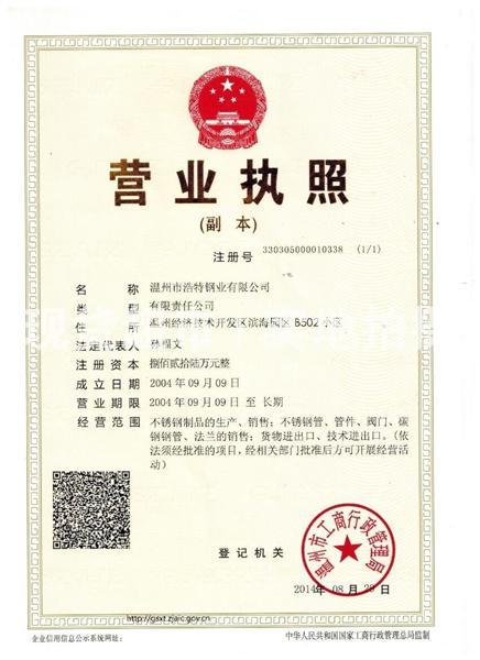 • 溫州市浩特鋼業有限公司,營業執照