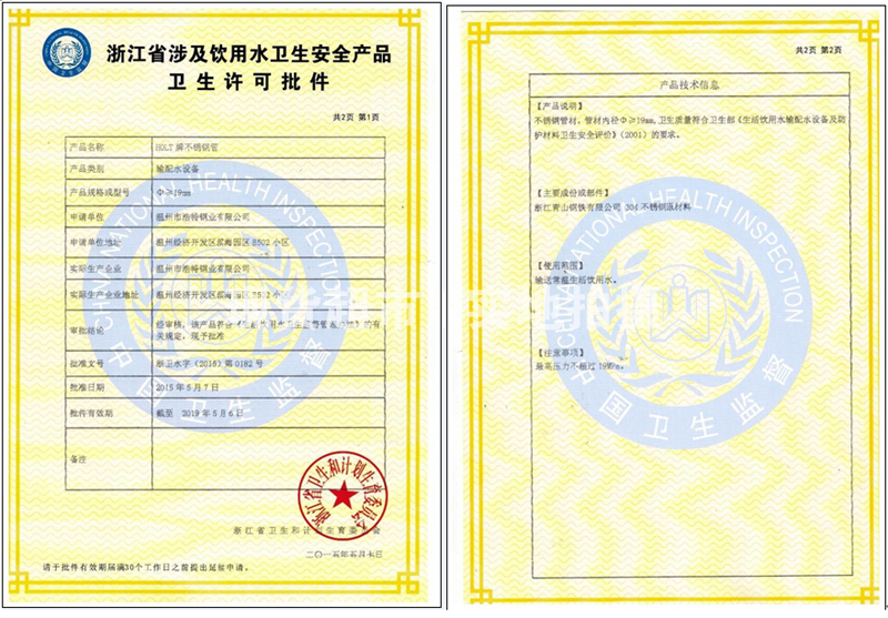 • 溫州市浩特鋼業有限公司,衛生許可證